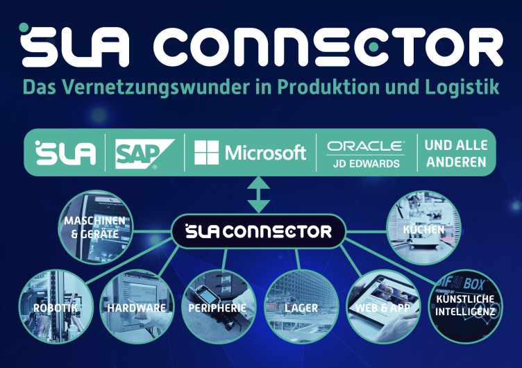 SLA CONNECTOR is the smart heart of your networked production. As a manufacturer- and system-independent solution, the connector connects machines, systems, robots, web applications, AI modules and many other components directly with your ERP system - in real time and without complex IT projects.